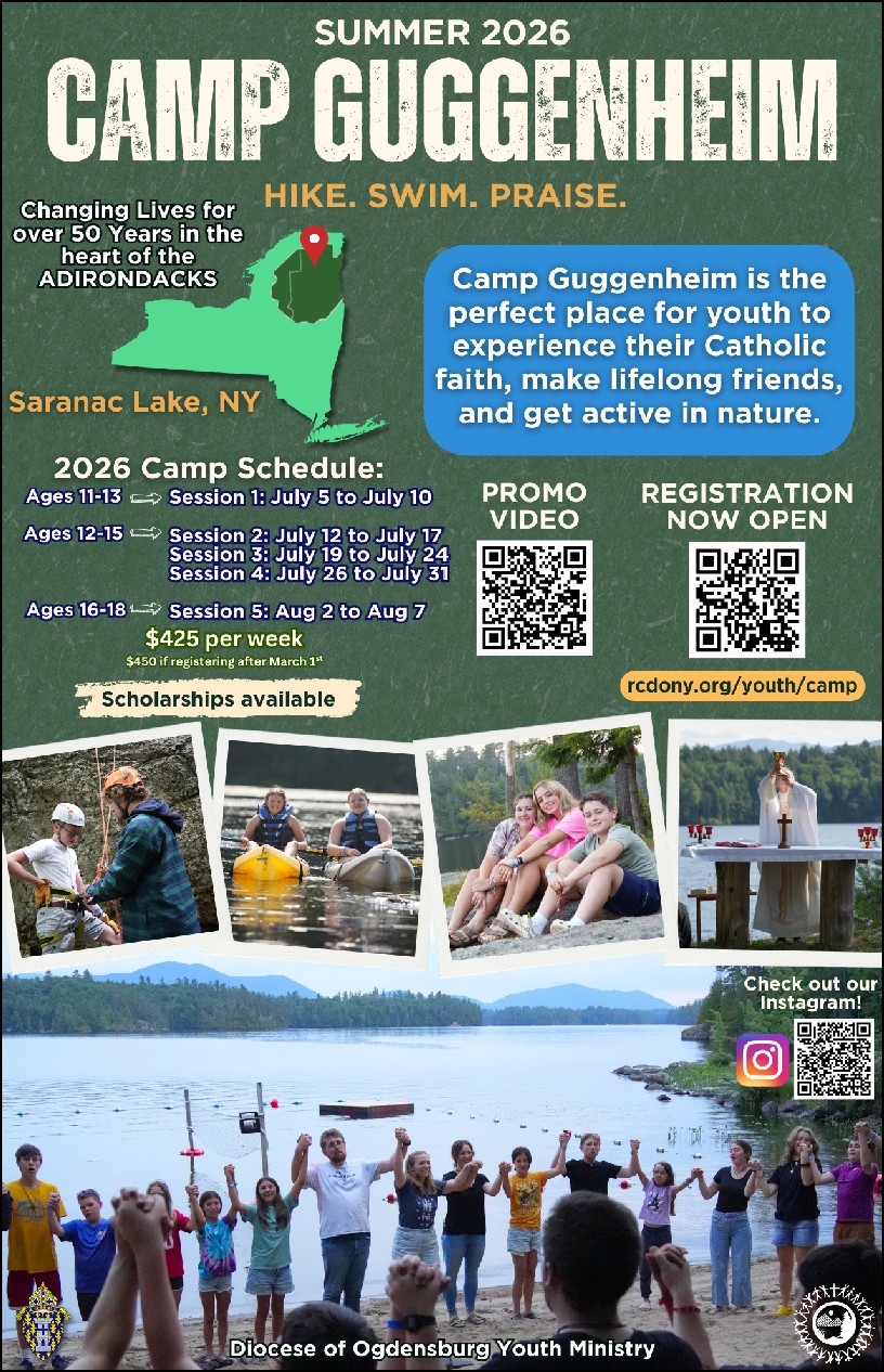 The Diocesan Catholic Men’s Retreat will be held on Friday, June 12 (arrival as early at 4 p.m.) until Sunday, June 14 (departure at 1p.m.) at Guggenheim Dorm, Saranac Lake. This year Father Leagon Carlin will speak about G. K. Chesterton. The retreat is open to men 18 years of age or older. Outdoor activities will include canoeing and hiking.