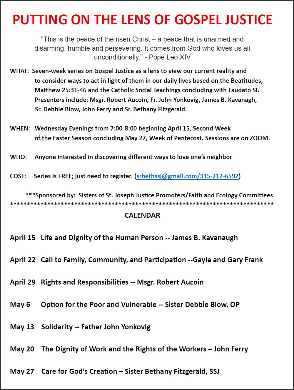 WHAT: Seven week series on Gospel Justice as a lens to view our current reality and to consider ways to act in light of them in our daily lives, based on the Beatitudes, Matthew 25:31-46 and the Catholic Social Teachings concluding with Laudato Si. Presenters include: Msgr. Robert Aucoin, Father John Yonkovig, Deacon JB Kavanagh, Sister Debbie Blow, Deacon Gary & Gayle Frank, John Ferry and Sister Bethany Fitzgerald.