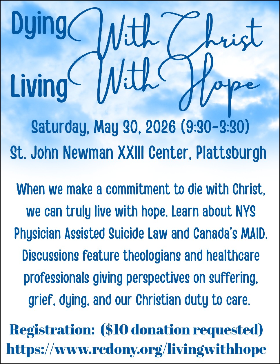 DYING WITH CHRIST, LIVING WITH HOPE: Saturday, May 30, 9:30 a.m. - 3:30 p.m. at St. John Newman Center, Plattsburgh