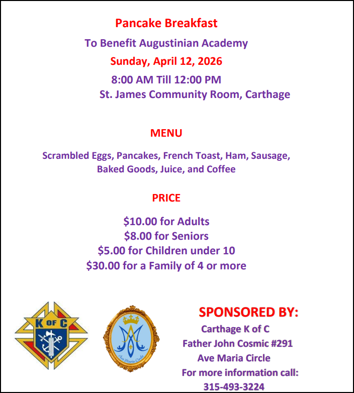 MONTHLY PANCAKE BREAKFAST: In Support of Augustinian Academy, Carthage