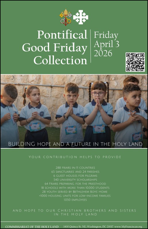 The Franciscans in the Holy Land are tasked with supporting the people and holy places in this ancient and precious part of the world. Please use the attached document, available in Word and PDF formats, to encourage your parishioners to support this second collection. See also the letter from the Commissariat of the Holy Land with additional talking points available here in PDF or WORD.