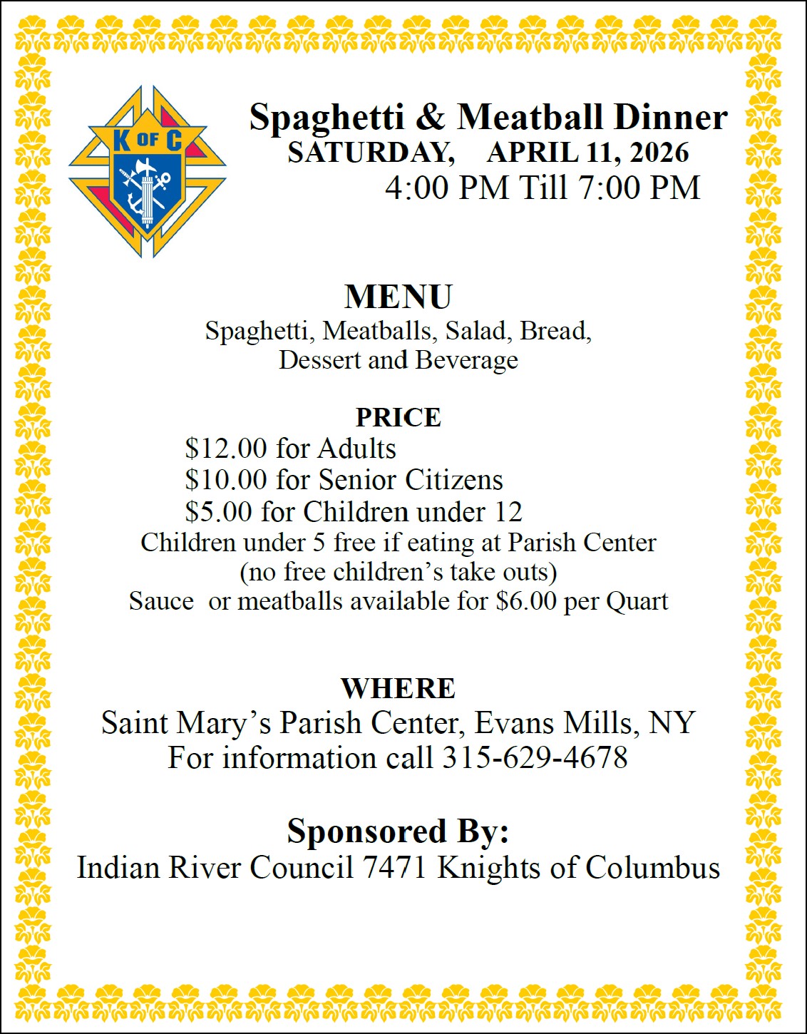 Spaghetti & Meatball Dinner, Saturday, April 11, serving from 4 to 7 p.m. at St. Mary's Parish Center in Evans Mills. Menus includes spaghetti, meatballs, salad, bread, beverage and dessert. Benefit Indian River Knights of Columbus.