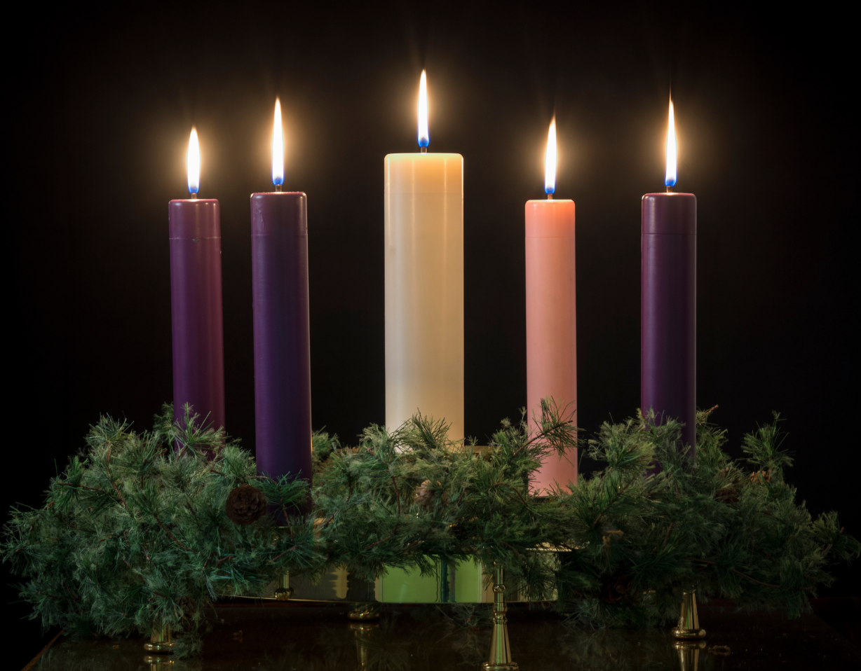 The Advent Wreath has four candles, 3 purple and one pink, each representing 1,000 years of waiting for Christ to appear. Each week starting on Sunday, another candle is lit, so that by the 4th week of Advent, all 4 candles are lit.