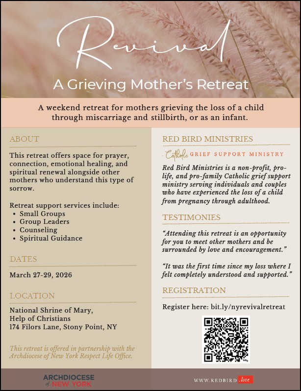 March 27-29: Revival, A Grieving Mother’s Retreat is an overnight weekend retreat that will be hosted by Red Bird Ministries for mothers grieving the loss of a child through miscarriage and stillbirth, or as an infant. This retreat offers space for prayer, connection, emotional healing, and spiritual renewal alongside other mothers who understand this type of sorrow. For more information and to register, visit: www.bit.ly/nyrevivalretreat. Full and partial scholarships are available.