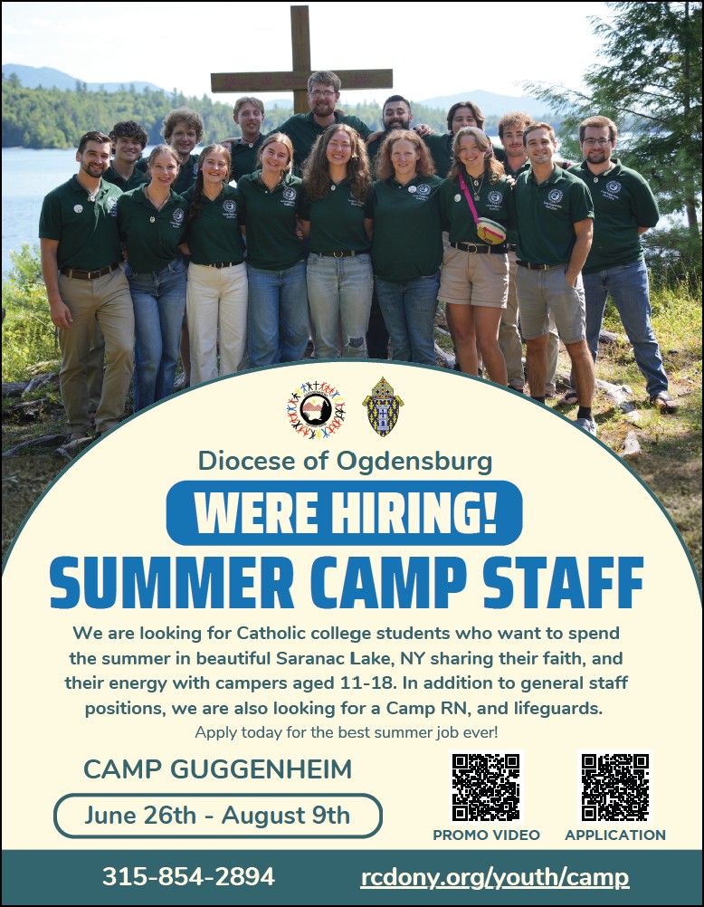 Camp Guggenheim is looking for energetic and passionate people to join our 2026 summer staff! RNs and Lifeguards are especially helpful, but anyone who wants to help spread the faith while having fun should apply: https://www.rcdony.org/youth/camp/new-staff-application