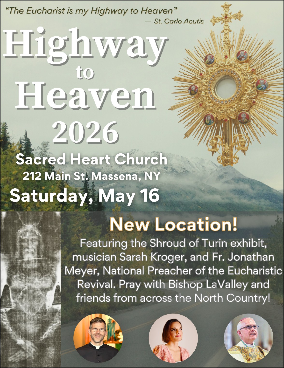 Save the date for Highway to Heaven 2026! | Saturday, May 16 – Sacred Heart Church, Massena, NY | Featuring the Shroud of Turin replica exhibit | Father Jonathan Meyer, National Preacher of the Eucharistic Revival | Award-winning musician Sarah Kroger | Join Bishop LaValley and friends from around the North Country and beyond for Holy Mass, Eucharistic Adoration, and more. Additional details coming soon!