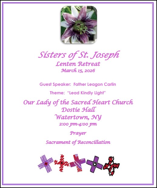 All are welcome to attend the annual Lenten Retreat at Our Lady of the Sacred Heart Dostie Hall, 320 West Lynde Street, Watertown on Sunday, March 15, 2026 from 2 p.m. until 4 p.m. Join us for an afternoon of prayer as we reflect on Christ’s call to move from our blind sights to a deeper insight into His life, death and resurrection presented to us by Father Leagon Carlin who is studying at St. Paul’s University, Ottawa. His theme is: “Lead Kindly Light”. There will be an opportunity for prayer and for the Sacrament of Reconciliation. Register with Sister Mary Eamon (smelyngssj@yahoo.com) or with Sister Bethany Fitzgerald (srbethssj@gmail.com) by March 10, 2026.