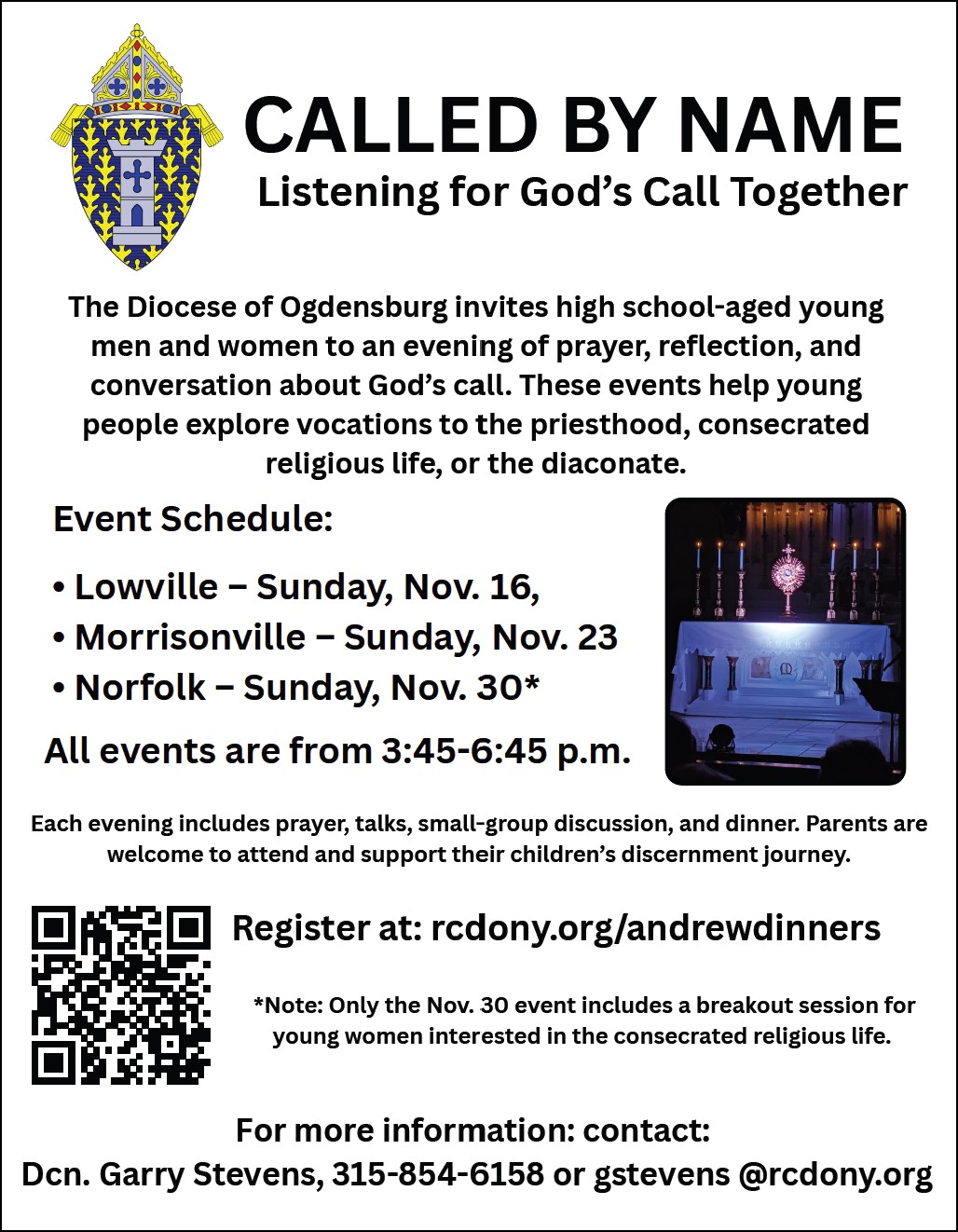 The Diocese of Ogdensburg invites high school-aged young men and women to an evening of prayer, reflection, and conversation about God’s call. These events help young people explore vocations to the priesthood, consecrated religious life, or the diaconate.