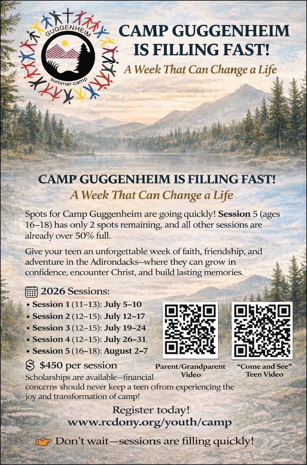 Ready for the best week of your life?! Registration is now OPEN for CAMP GUGGENHEIM! Scholarships are available so, don't let the cost of camp get in the way! So many people credit their time at camp as a life-changing experience! You can be next! Weeks are available for ages 11 to 18. www.rcdony.org/youth/camp