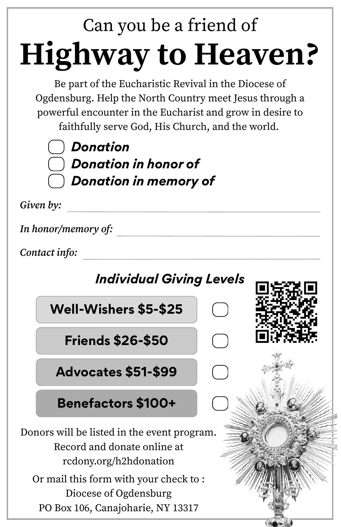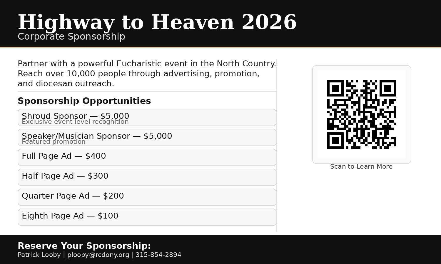 We invite local businesses to partner with us in making this powerful Eucharistic event possible. Sponsorship opportunities include program ads and event recognition, reaching over 10,000 people across the North Country. Multiple levels of support are available.