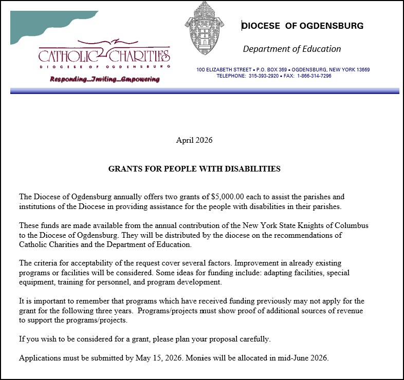 The Diocese of Ogdensburg annually offers two grants of $5,000 each to assist the parishes and institutions of the Diocese in providing assistance for people with disabilities.