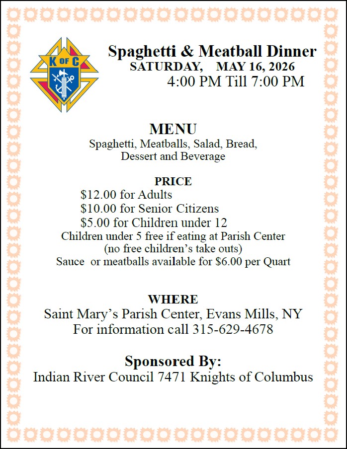 Spaghetti & Meatball Dinner, Saturday, May 16, serving from 4 to 7 p.m. in St. Mary's Parish Center in Evans Mills to benefit Indian River 7471 Knights of Columbus.