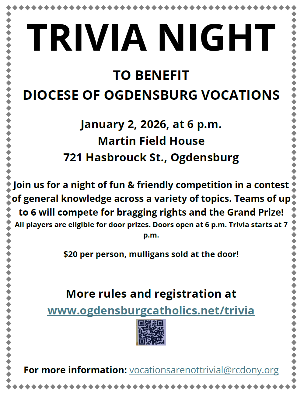 The Vocations Committee for the Catholic Churches of Ogdensburg (St. Mary’s Cathedral and Notre Dame), Heuvelton (St. Raphael’s) and Lisbon (Ss. Philip and James) is planning a Trivia Night for Friday, January 2, at the Martin Fieldhouse, 721 Hasbrouck, Street, Ogdensburg. All funds raised will be donated to the Diocese of Ogdensburg to help offset the miscellaneous college costs for the seminarians. Join us for a night of fun and friendly competition in a contest of general knowledge across a variety of topics! Teams of up to 6 will compete for the bragging rights and the Grand Prize. All players are eligible for door prizes! Mulligans will be sold at the door. Doors open at 6 p.m. Trivia starts at 7 p.m. More rules and registration at www.ogdensburgcatholics.net/trivia or use the QR code